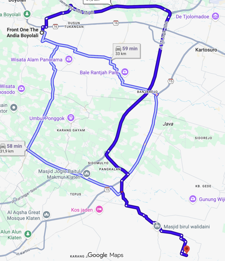 Jaraknya 53 km dari hotel ke rumah bude, dari Boyolali ke Klaten. Ujung ke ujung ya, tapi nggak kerasa sih karena saya sambil buka laptop di mobil ngerjain tugas juga. Dan saya baru tau kalau ongkos tolnya 50 ribu sendiri, lumayan juga.